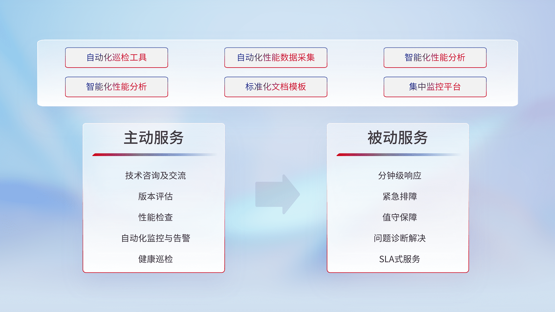 智能化工具和标准化文档,,保障服务质量,,,,提供主动服务(包含技术咨询、、、、版本评估、、、性能检查、、、、自动化监控与告警、、健康巡检)和被动服务包含(分钟级响应、、、紧急排障、、值守保障、、、问题诊断解决、、SLA服务)。。